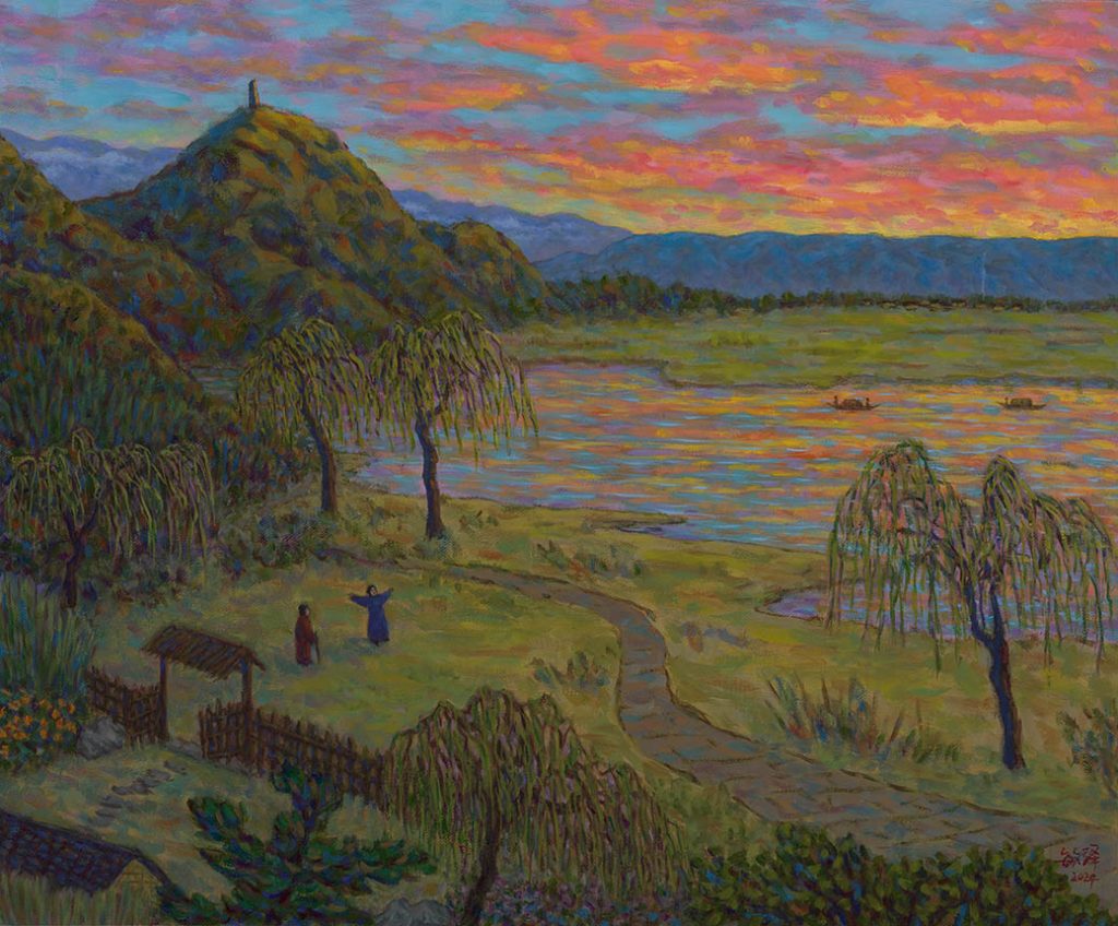 與此同時,《海寧陳家安瀾園重建計劃》也被我排入工作進程。不過,2021年晚秋,安瀾園計畫尚處於資料研究的階段,某日我忽然很想畫險峻山峰,於是柳宗元的〈江雪〉,便成為《四季唐詩精選》系列的第一件作品。之後隨著腦中安瀾園的樣貌逐漸成形,考量父親年事已高、健康情況亦不穩定,決定先進行安瀾園計畫,並以「父親在安瀾園內的肖像」為起手式。2022年冬安瀾園全系列結束,緊接而來的新家裝修、搬遷、整理,耗時大半年總算塵埃落定,開啟人生新階段。休養了一陣,中間又有些插曲,直至2023年末,唐詩系列第二件、孟浩然的〈過故人莊〉方才完成。這幾年由於呼吸道過敏因素,我的油畫創作時段僅限於氣溫舒適、可開窗通風的季節,因此產量大減;唐詩系列拖延許久,最終在2025年3月,以杜甫的〈旅夜書懷〉收官。