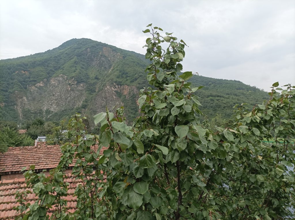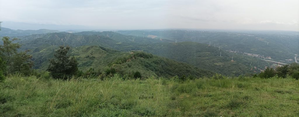 〈簡圖〉標示的輞川莊和其他《輞川集》提及的地點,乃是依照詩句描述推測而得的大略位置,並無考古發掘的證據支持;而我的創作構圖也並不拘泥於某個定點的視角,畢竟詩人記述的通常是某區域範圍的移動軌跡。所以,我沒有堅持要找到〈簡圖〉的輞川莊位置,就看沿線哪裡開車容易抵達,或者視野較好。由於G70高速公路的阻隔,要到河邊並不容易;於是我們在高速公路東邊地勢較高的村莊,應是〈簡圖〉的北垞與韓公坡之間,停車下來查看,並借路邊民宅的二樓觀望。下面兩張照片是民宅南邊的山頭,亦即推測的斤竹嶺。