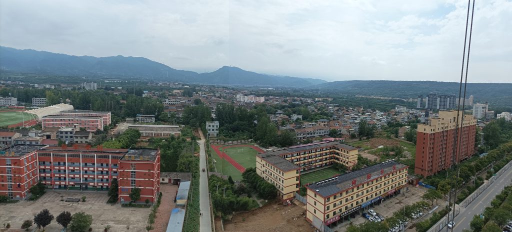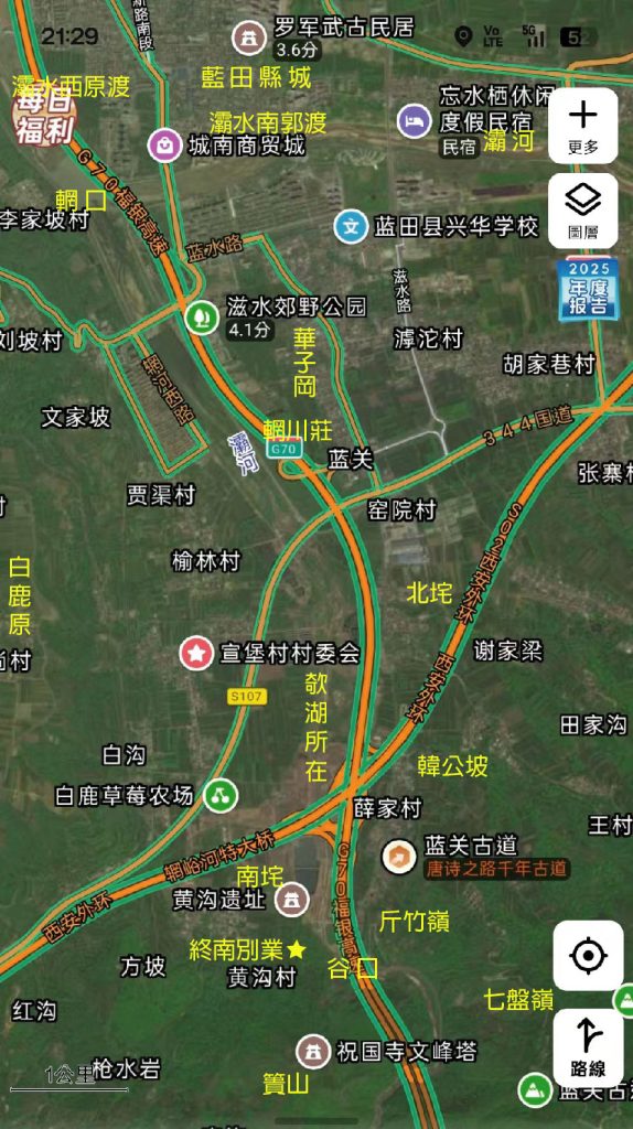抵達藍田縣城之後,我們找了一處新建的樓盤,登上高樓層朝谷口方向眺望,從簣山到七盤嶺乃至東側山區的天際線,與前一個拍攝點相同,文峰塔仍清晰可辨,同時還能望見西邊的白鹿原。從王維的時代到現在,一千兩百多年過去了,雖然欹湖早已消失,但山、原的地形並未明顯改變;我們眼前的天際線,與王維看見的,應是同一副模樣。若是住在這裡,「每天與王維同賞一片景」,感覺生活似乎就……莫名浪漫起來了呢。