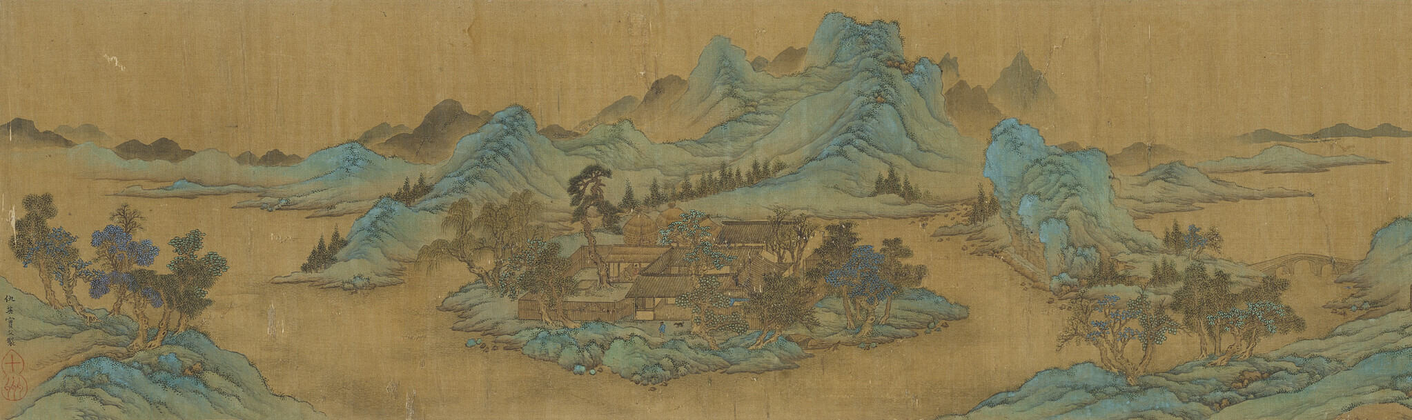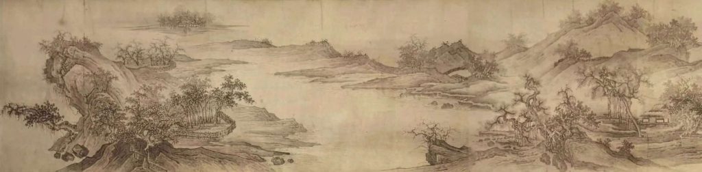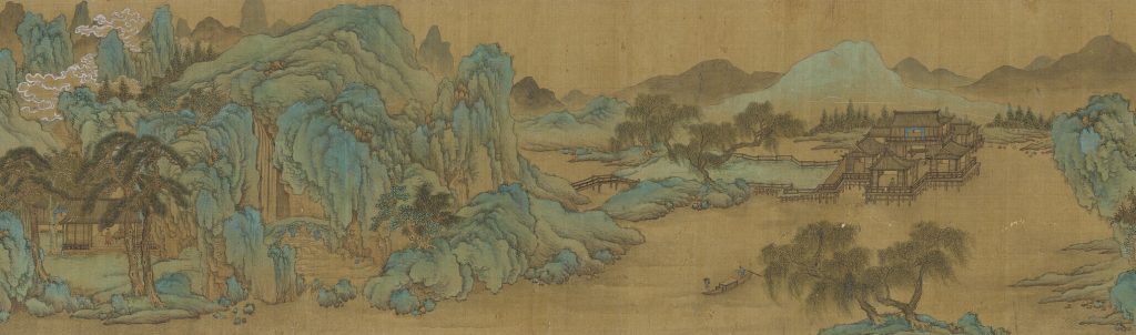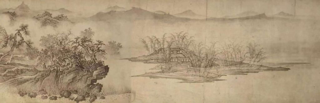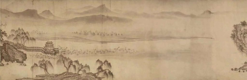 反觀〈國博本〉長卷中段,宮槐陌與前一景茱萸沜的距離增加,一條大樹遮蔭的小路經過房舍前,意指〈宮槐陌〉詩首句「仄徑蔭宮槐」。鹿柴之後,空間更是整個拉開:北垞變成畫面上端的一方小島,下面是椒園和漆園,左側高起山頭上應為辛夷塢(其餘版本將這三景置於卷末);再過來,竹里館也移至湖中島上,背後遠山高聳,山腰雲霧迷漫,呼應〈欹湖〉詩句「湖上一回首,青山卷白雲」。接著南垞和可能是欒家瀨旁的房舍(其餘版本無此屋)之間,瀰漫著高山流瀉下來的瀑布所激起的水霧,與〈南垞〉詩句「隔浦望人家,遙遙不相識」合拍。臨湖亭和柳浪,與前一景之間空出一大片水面,背景是雲氣繚繞的高山,真個是煙波浩淼,彷彿置身五湖。臨湖亭周圍水面滿佈荷葉,對應詩句「四面芙蓉開」。最後一段為白石灘和金屑泉;特別的是,卷末流泉所出的高山嶺上道路盤曲,是否意指七盤嶺的唐代驛路,殊堪玩味。