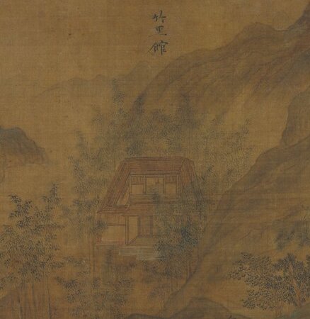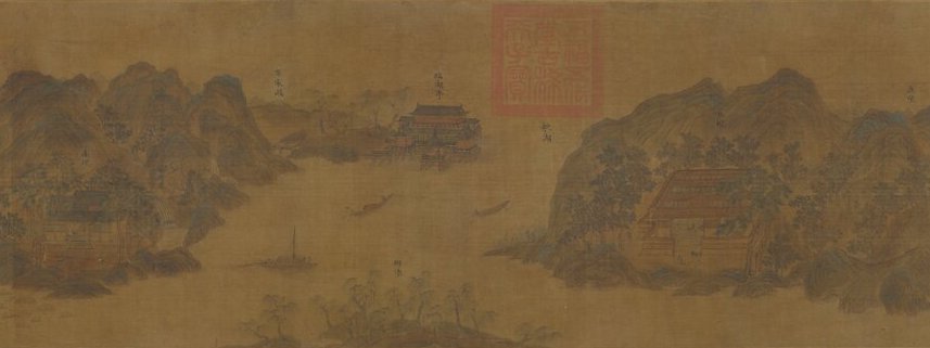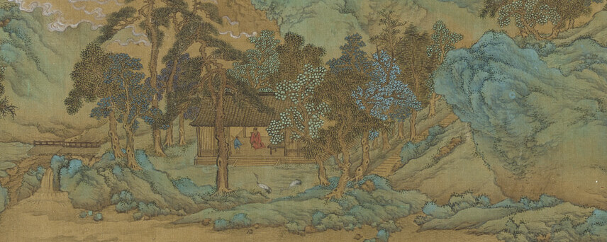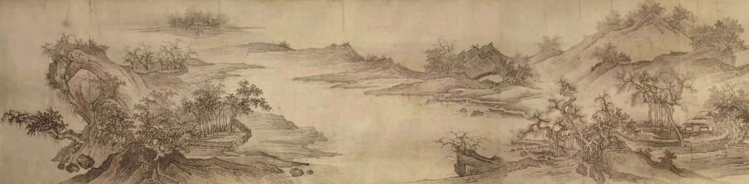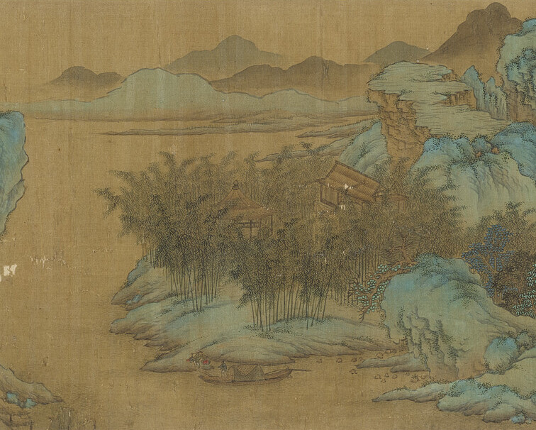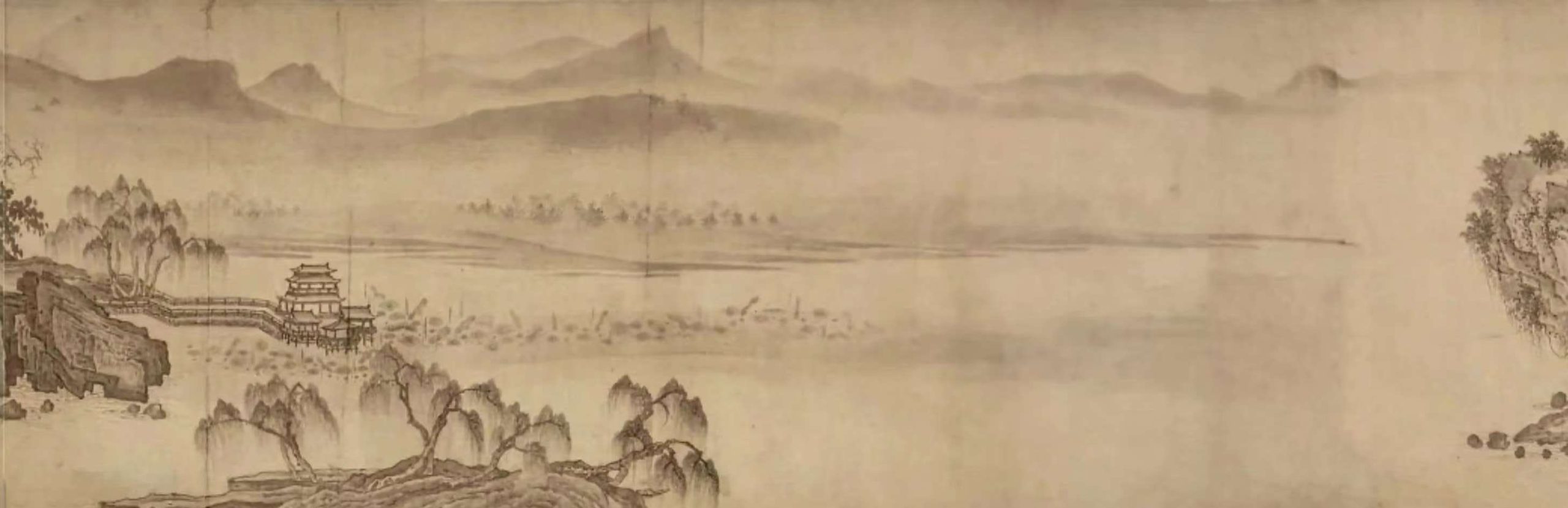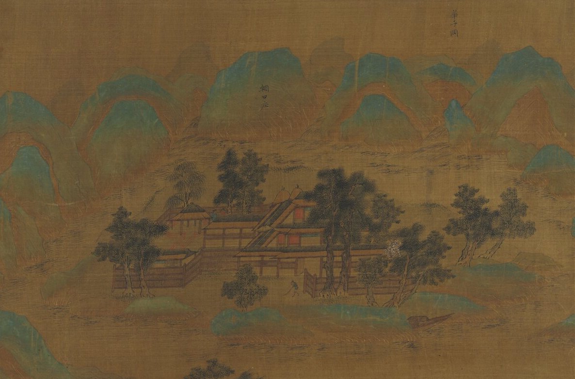 在臨湖亭這段,仇英沒有選擇像〈國博本〉那樣把畫面整個拉開,保留了〈宋本〉山嶺間距相近的格局,卻在臨湖亭背後,加上水岸樹林及數重平緩遠山。這一手神操作,便使欹湖擴大至臨湖亭後方的廣闊區域,甚至一路延伸到竹里館背面,再和輞水連通。事實上,根據簡錦松教授論文所述,王維時代的欹湖,的確與輞水相通,且非輞水主河道的一部分。
