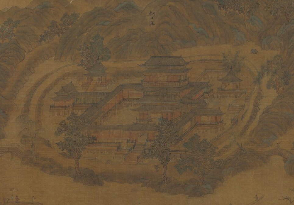 〈宋本〉、〈郭本〉、〈郭本一〉畫中的建築物造型與位置順序均高度相似,毫無疑問系出同源;山嶺則風格差異較明顯,但形勢雷同,都顯出峰巒疊嶂的崎嶇樣貌。然而,王維輞川詩所描述的景色開闊;欹湖之大,水氣瀰漫,南北垞互不相望。可見不論哪個版本的〈輞川圖〉,各景點相對位置安排的邏輯矛盾,甚至對詩句的理解都有問題,顯然並非按照實景繪製,自不可能源出王維手稿。這讓人不禁想問:歷代〈輞川圖〉摹本的作者們,都相信原圖為真嗎?〈郭本一〉的建築物標註,便和〈宋本〉之間有著饒富趣味的異動,讓我們看圖推測這個變化的緣由。〈宋本〉輞口莊長相如下圖: