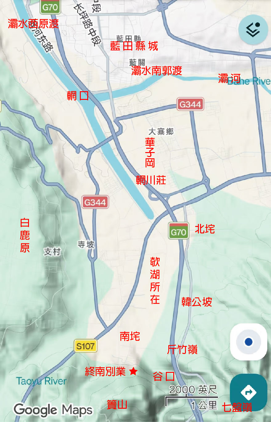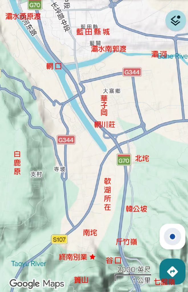 我分別用谷歌地圖的地形圖、高德地圖的衛星圖為底圖,標註〈簡圖〉各點重新繪製,但是把谷口以南的區域省略了,因為本文不打算耗費篇幅討論錯誤地點,有興趣的觀眾可以自行搜尋「藍田縣輞川鎮」地圖。製作兩個版本的原因是,谷歌地形圖雖然較易看出山勢與坡地走向,但是道路和水系疊圖失誤,明顯向東偏移,而且長寬比例也與高德地圖對不上;高德地圖的衛星圖可以看到正確的道路與水系近況,現有地名標示也較多,但山勢較難分辨。